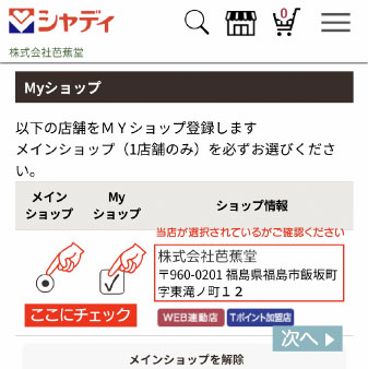 「メインショップ」「Myショップ」にチェックを⼊れて登録します。
